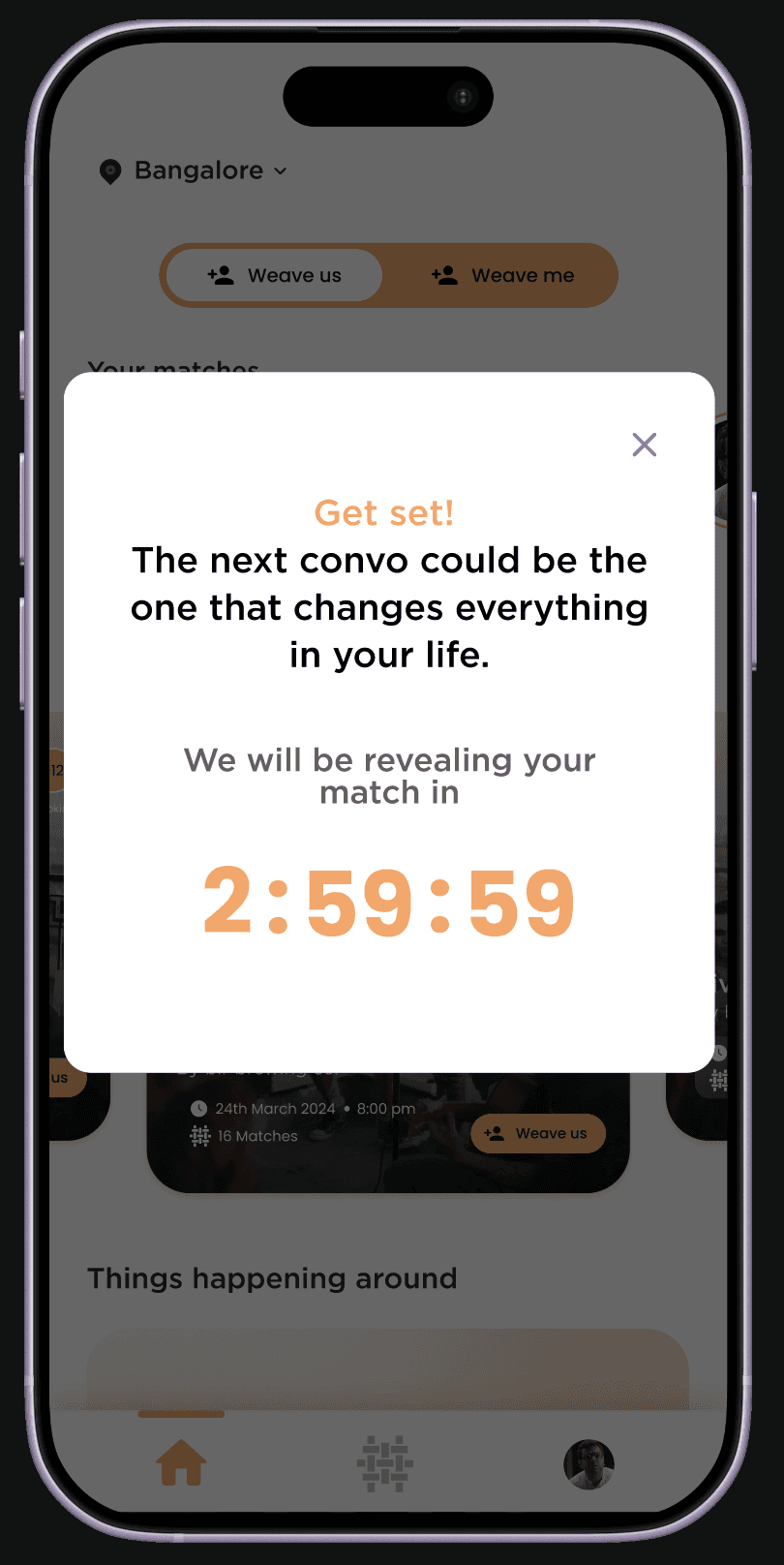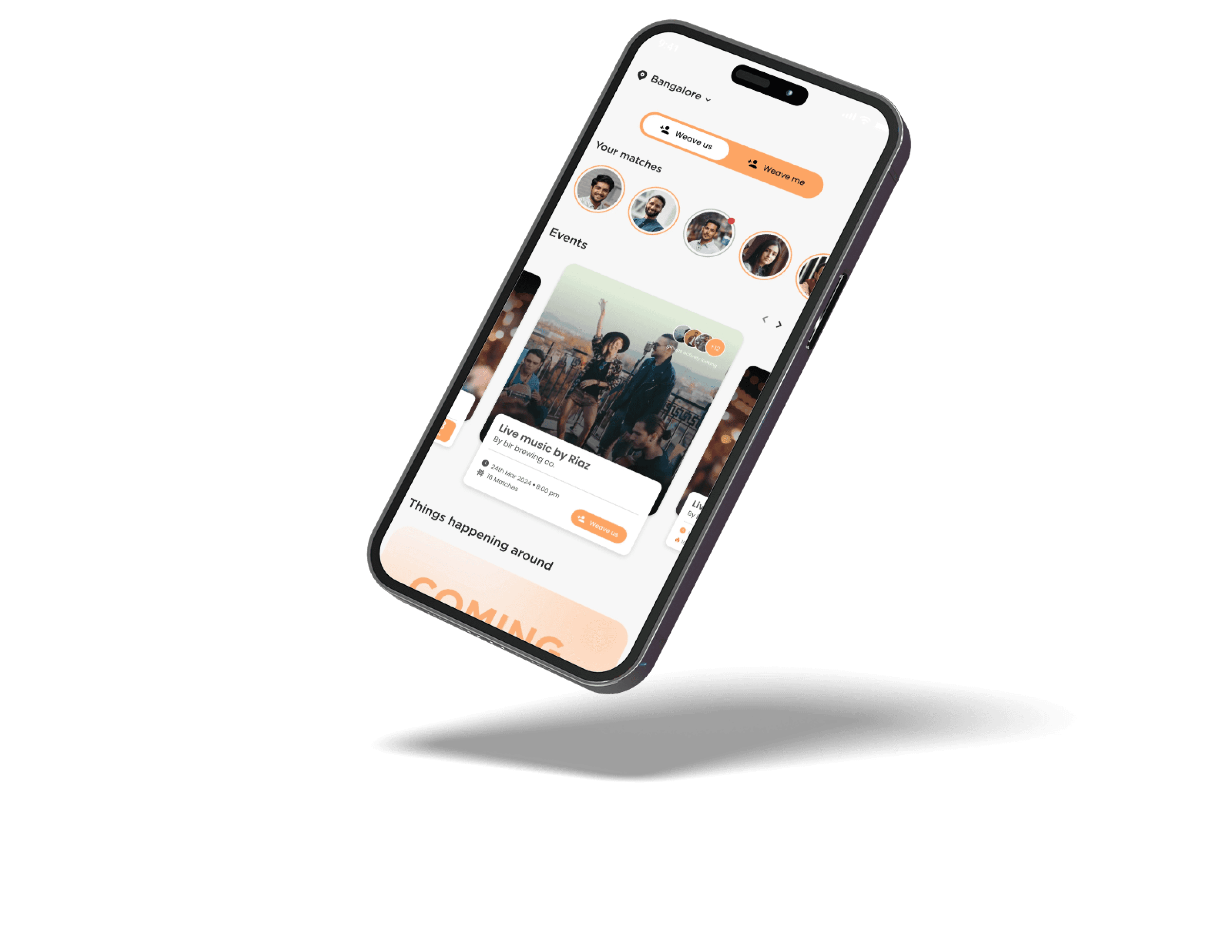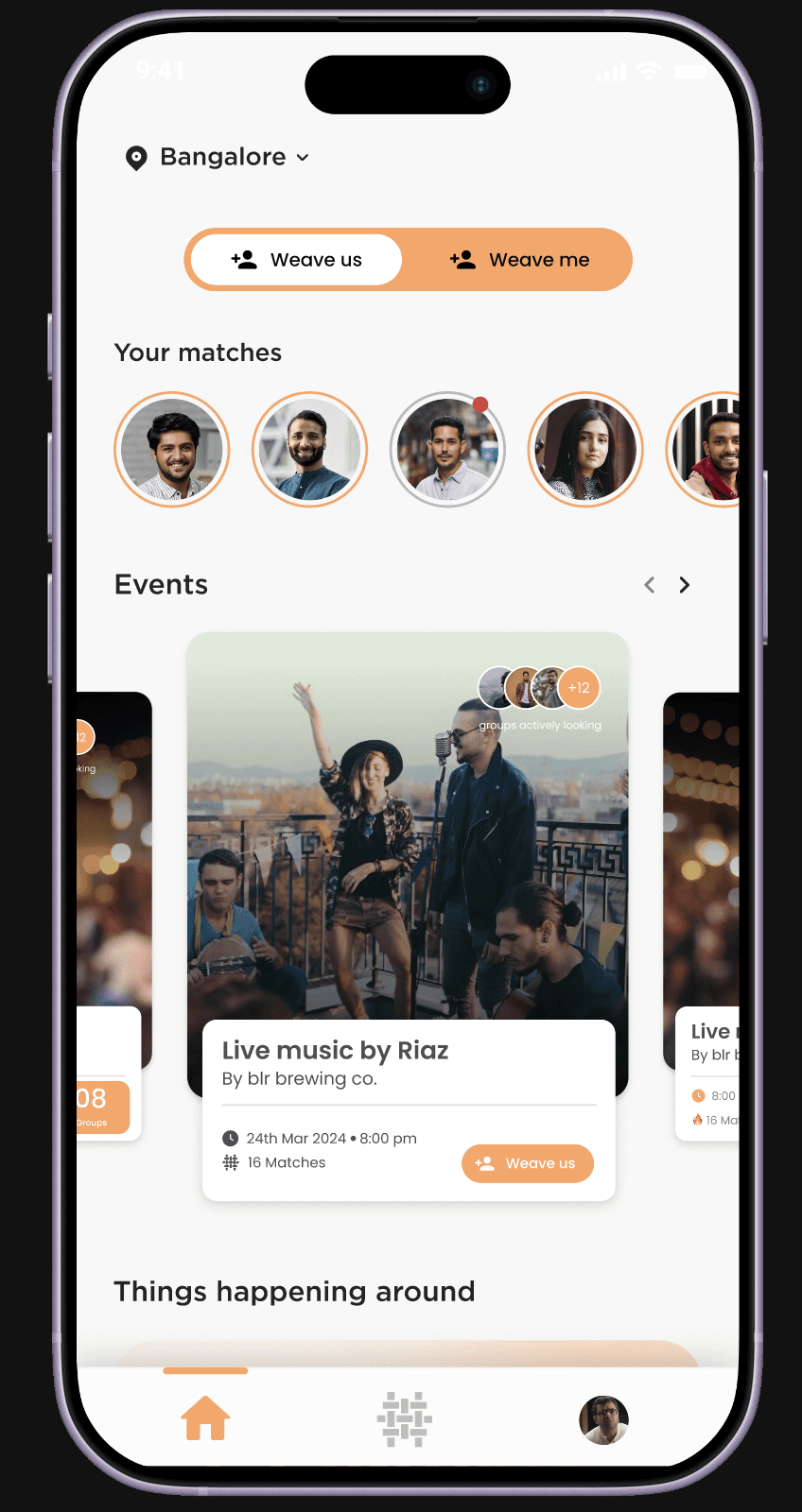 The brief for Weave came from a clear gap in the market, but the motivation behind taking it on was more personal. India's metros are full of young people — students, first-jobbers, people who've just moved cities — who are technically surrounded by people but functionally alone. Existing apps asked them to swipe through profiles in isolation and somehow turn that into a real human connection. That model was broken by design. The opportunity here was to build something that understood how people actually want to meet — around shared experiences, with the event as context and the app as infrastructure. Organising our own events to watch that dynamic play out in real life before drawing a single wireframe was not just a research method. It was a design principle: observe first, design second, never the other way around.