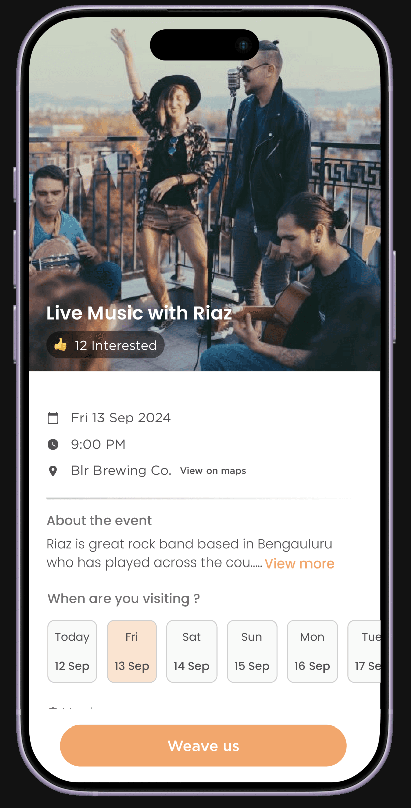 Tapping an event opens a detailed view containing the full event description, venue address, date and time, and programme or lineup where applicable. Users can view aggregated ratings and community reviews from past attendees, as well as the number of other Weave members who have expressed interest. A booking action is surfaced prominently once the user has reviewed the event information.